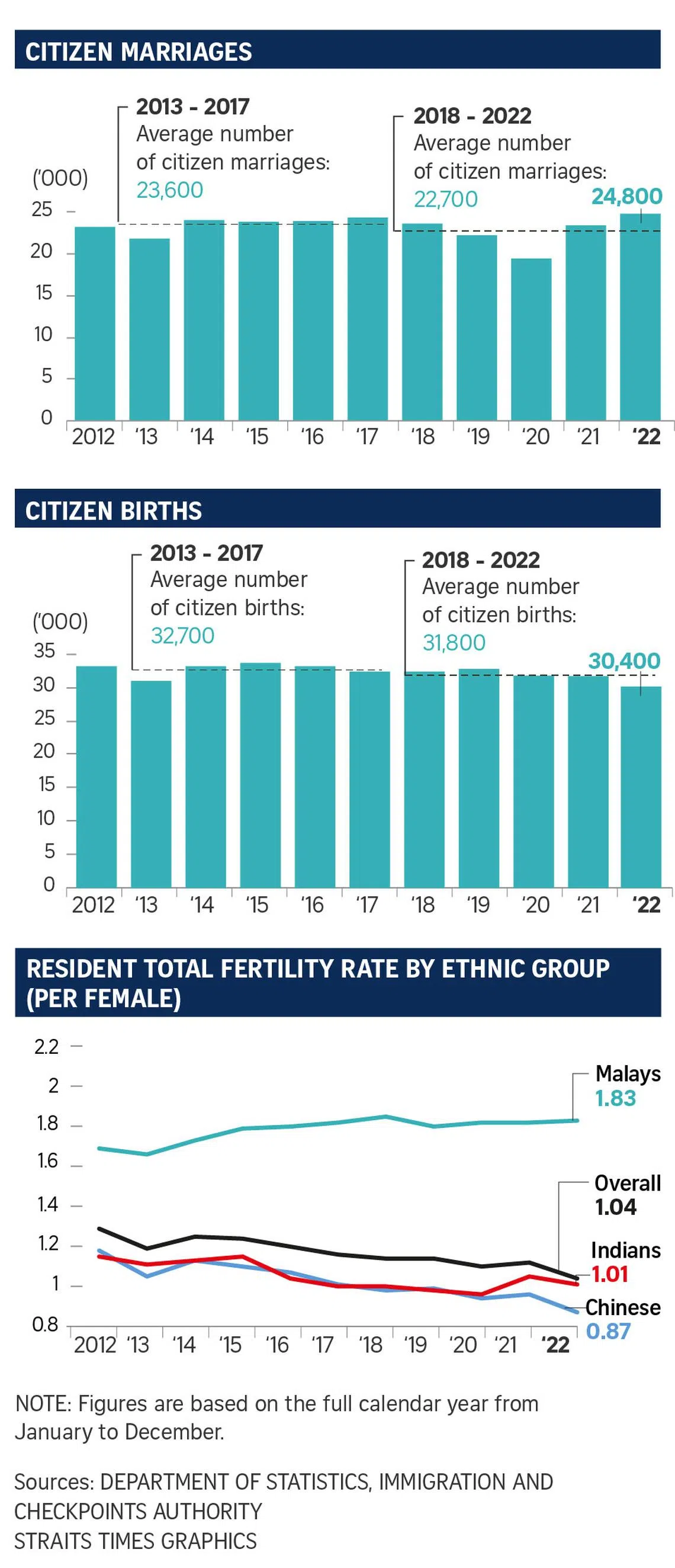 There were 30,429 citizen births in 2022, down 4 per cent from 31,713 in 2021, with the resident total fertility rate (TFR) reaching a historic low of 1.04 in 2022.