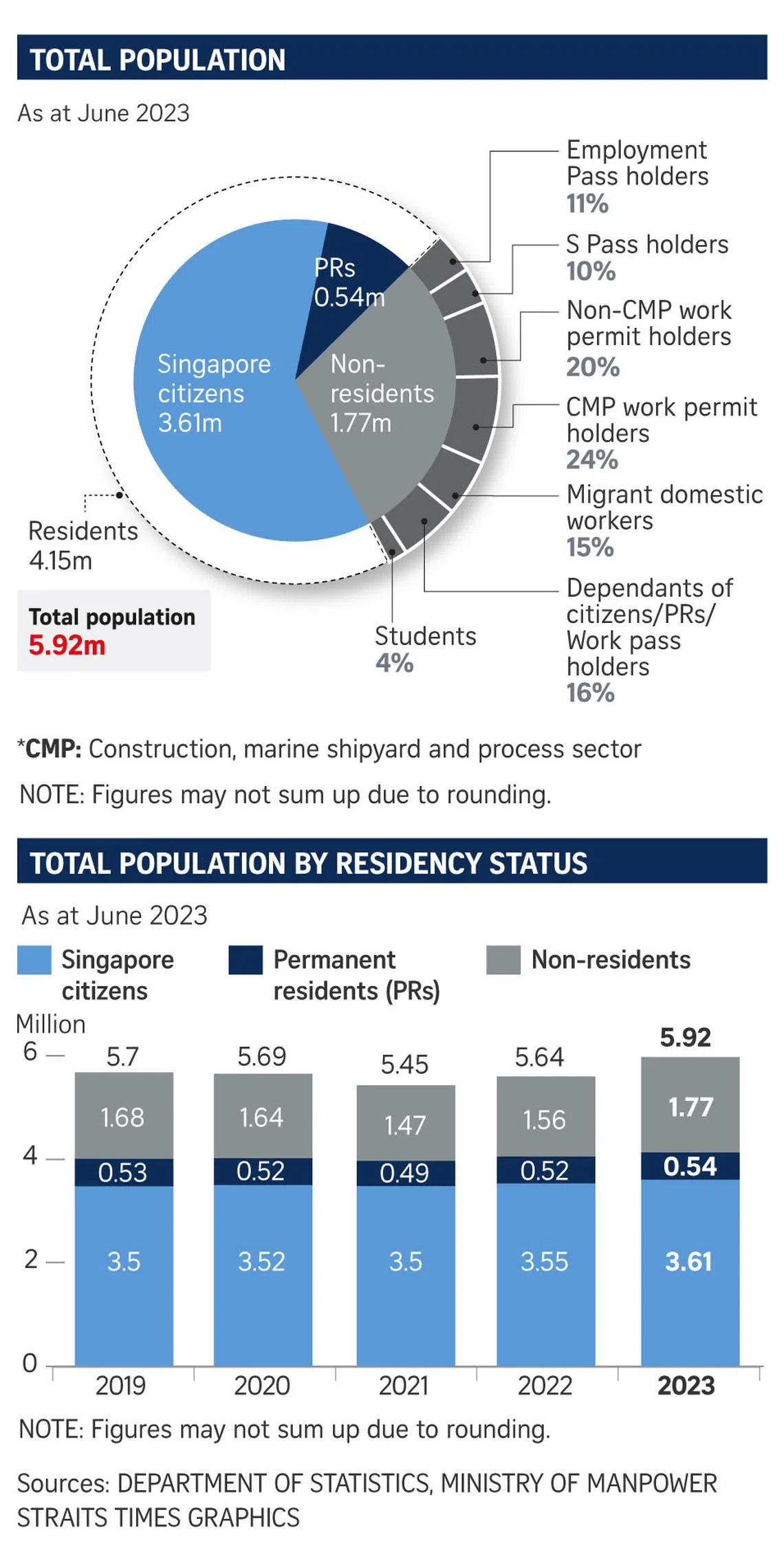 The citizen population grew by 1.6 per cent to 3.61 million in June 2023, from 3.55 million in June 2022; while the number of PRs rose by 3.7 per cent, from 0.52 million to 0.54 million, in the same time period.