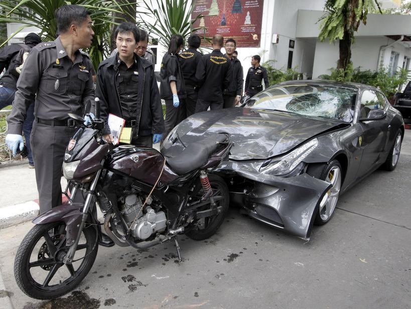 He faces charges of speeding, hit-and-run and reckless driving causing death over an incident in 2012 when he allegedly crashed his Ferrari into a policeman on a motorcycle in Bangkok and fled the scene, dragging the officer's body for several dozen meters with his car as he did so.