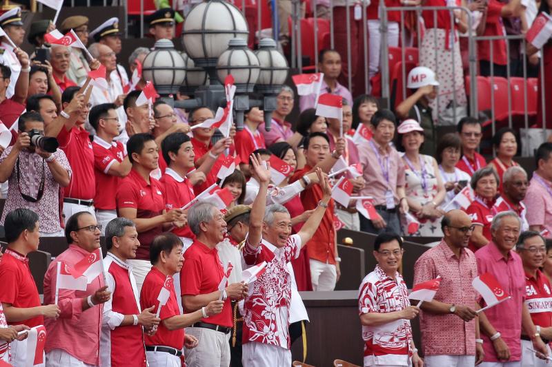 Prime Minister Lee Hsien Loong sported a red-and-white shirt with a motif of the Vanda Miss Joaquim orchid, Singapore's national flower.