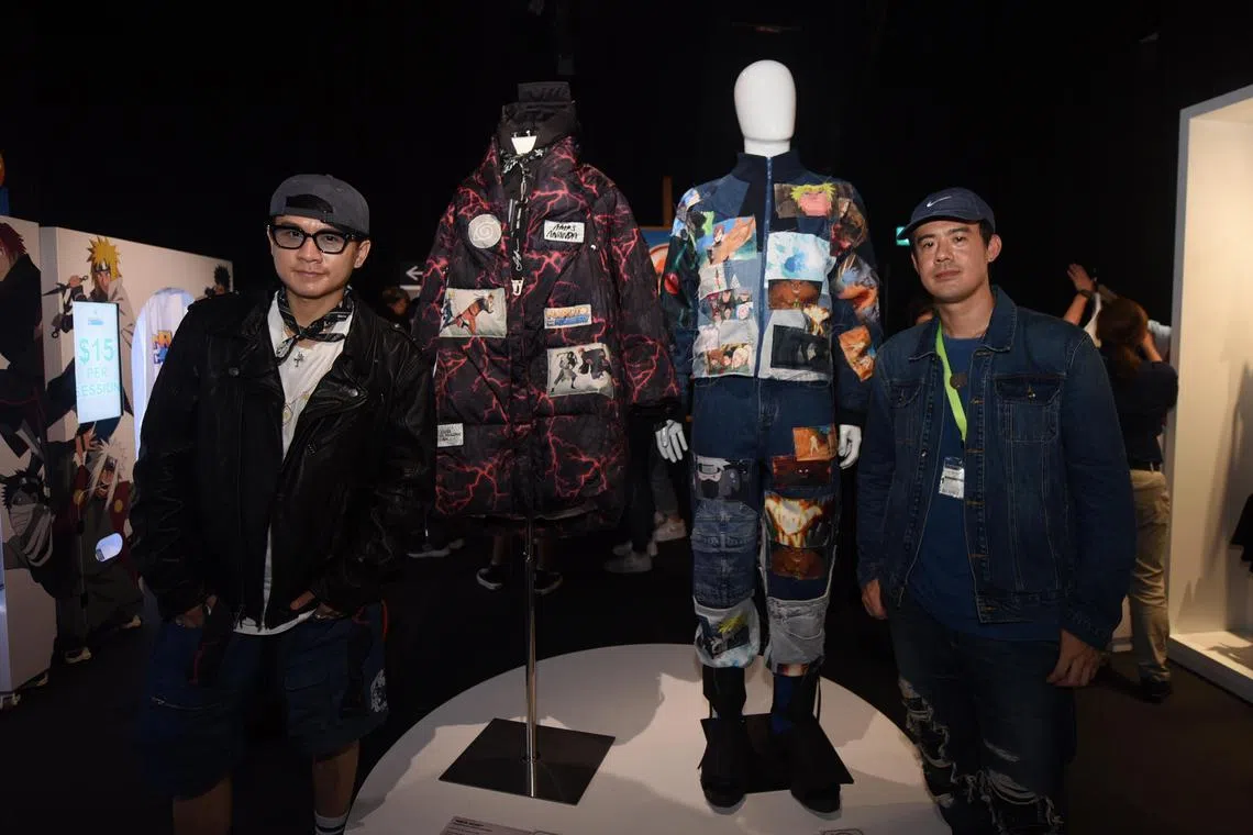 Singaporean fashion designers Amos Ananda (left) and Josiah Chua (right) with their Naruto-inspired outfits at Naruto: The Gallery on March 27.