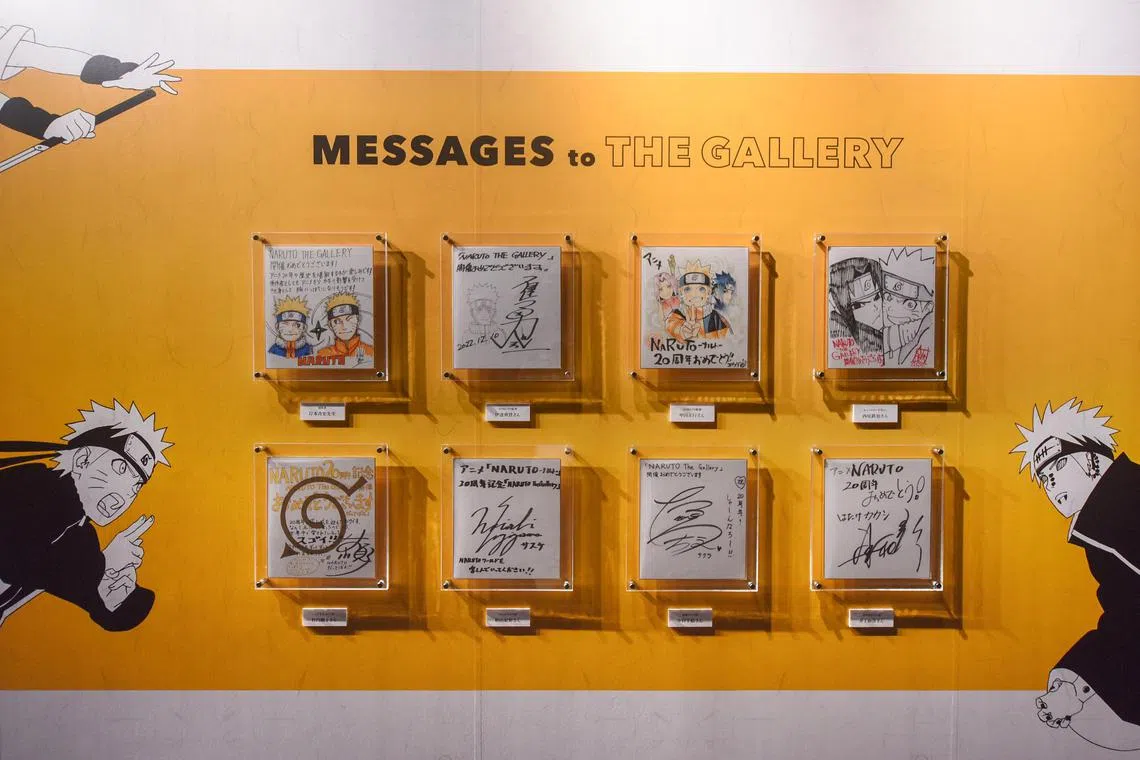 At the entrance of the exhibition, visitors are greeted by framed messages from those involved in the anime and manga’s production, including author Masashi Kishimoto and Junko Takeuchi, who voices Naruto.