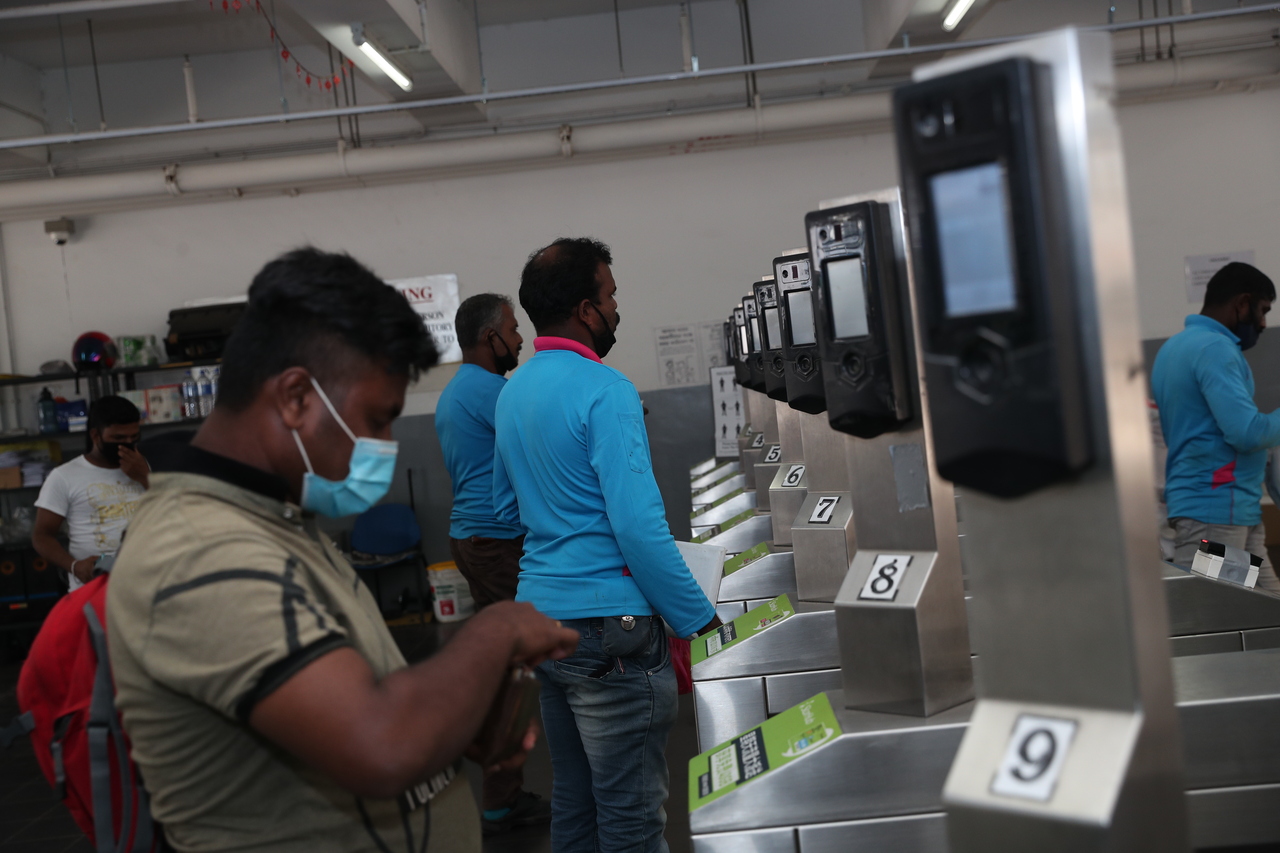 Workers having their faces scanned on their return to Sungei Tengah Lodge after work on Aug 5, 2020.