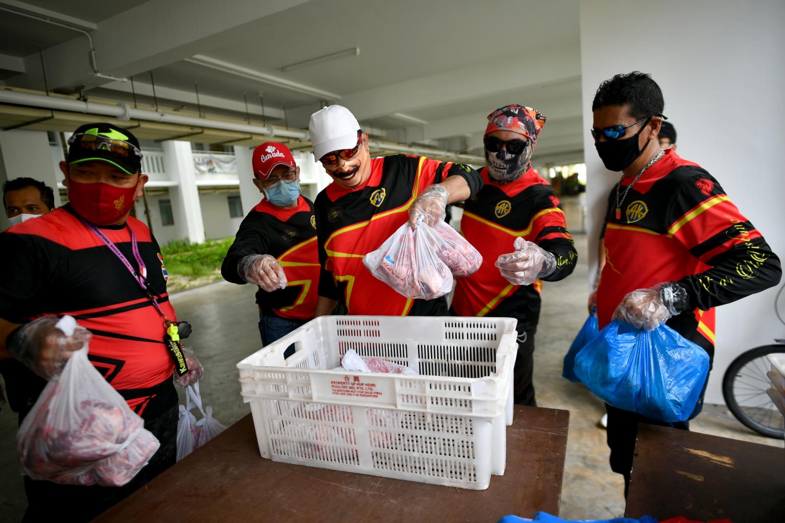 Volunteers collecting packets of korban meat for distribution at Block 182 Rivervale Crescent on Aug 15, 2020.