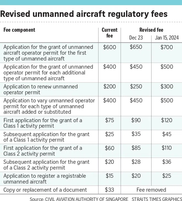 Other than the registration fee for registrable drones, which will increase from $15 to $20 on Dec 23, and to $25 on Jan 15, 2024, the other regulatory fees affect both operator and activity permits.