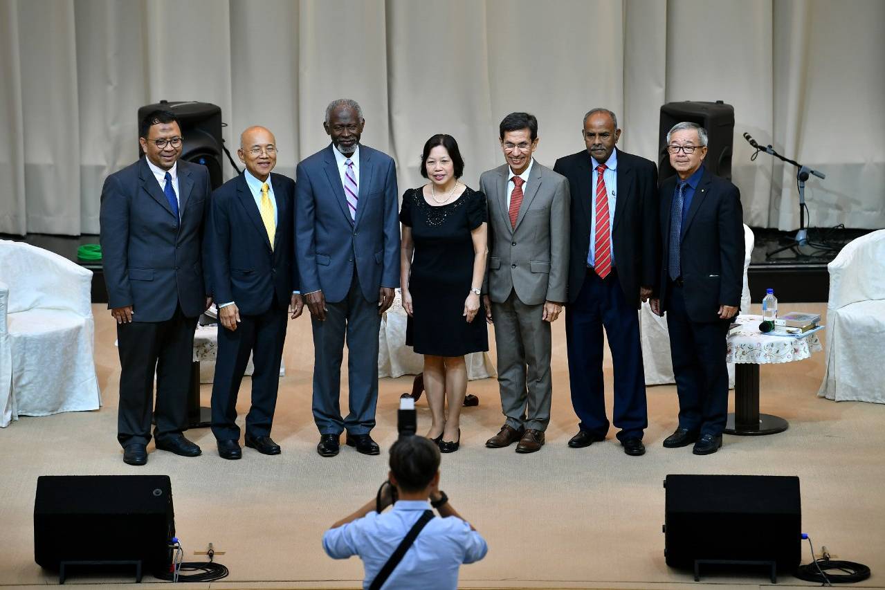 Attendees of the conference (from left) Dr Mohammad Hannan Hassan, Mr Tay Eng Kiat, Dr Lawrence Edward Carter Sr, Mdm Chan Mei Wah, Ambassador Mohammad Alami Musa, Ambassador K Kesavapany and Mr Michael Yap taking a group photograph at the end of the symposium.