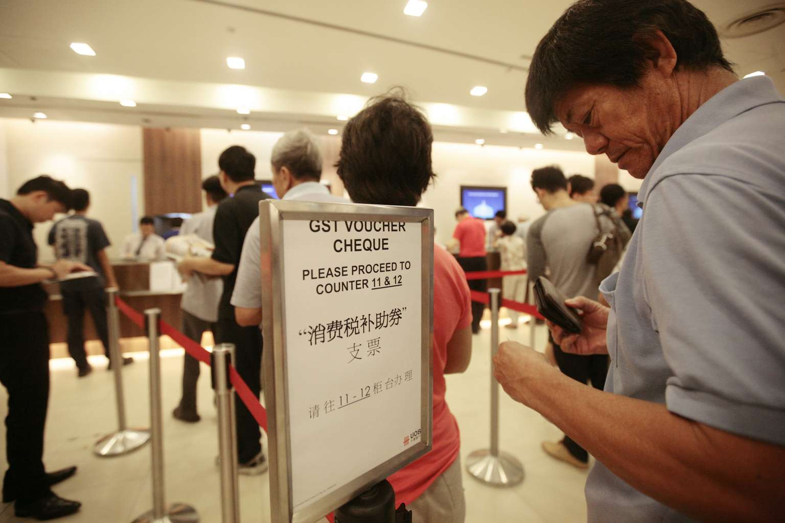 Singaporeans queueing at the UOB branch in Ang Mo Kio to encash their GST Voucher cheques on July 31, 2012.