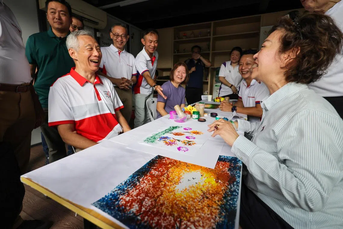 Senior Minister Lee Hsien Loong participating in a painting activity with Lentor resident Christina Thai (right) on Dec 1.
