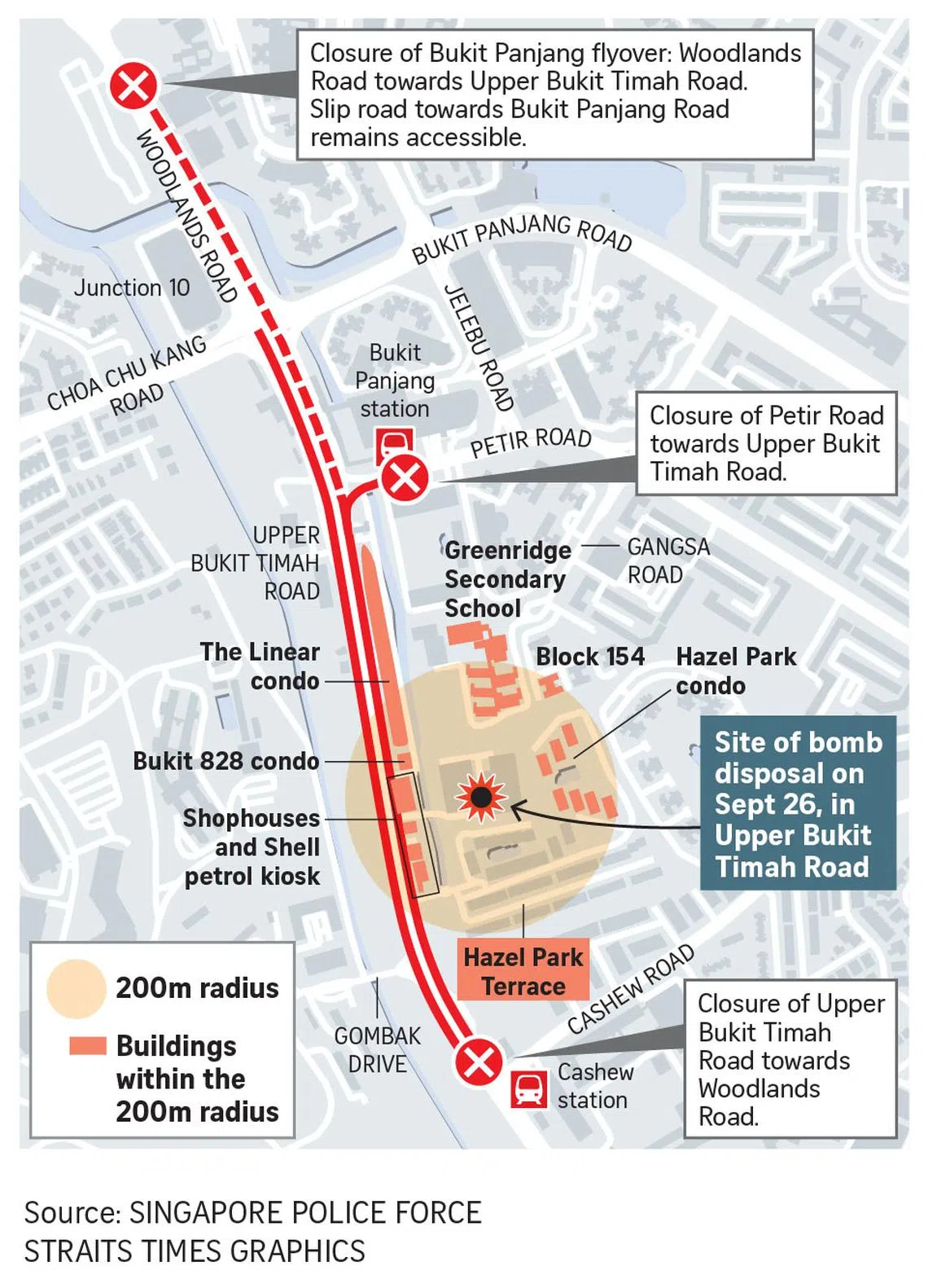 The Bukit Panjang Flyover between Woodlands Road and Petir Road, and Upper Bukit Timah Road between Petir Road and Cashew Road will be closed to traffic from 11am to 7pm on Tuesday while the bomb disposal takes place, it added.