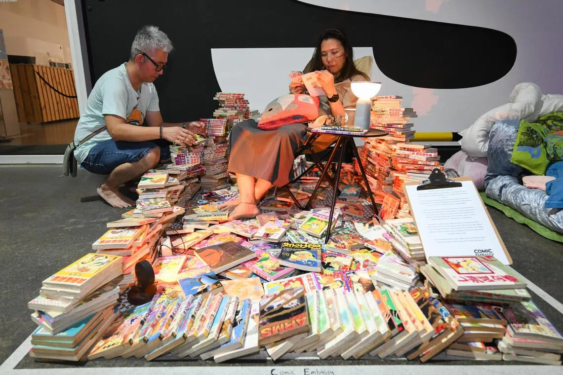 Comic lovers Ho See Kum, 48, and Oscar Ng, 54, designed a space filled with comics to express how reading comics is “restful” for them.