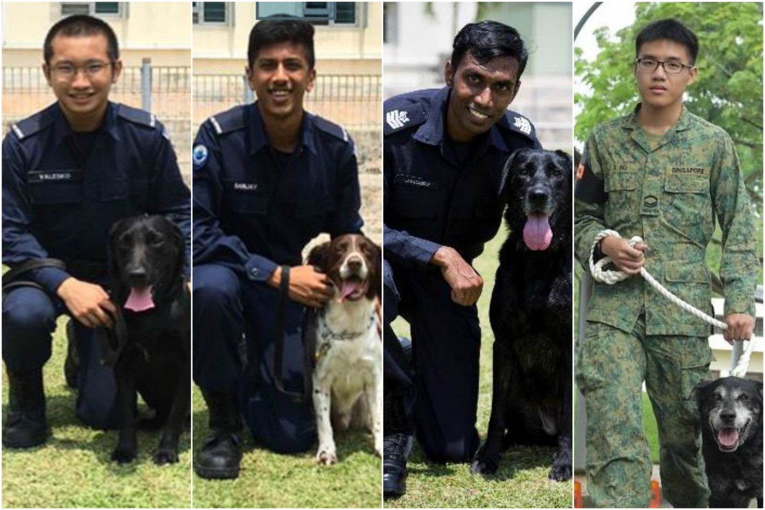 (From left) Private Valesko Seow with an SCDF urban search and rescue dog, a labrador; Private Sanjay Nair with an SCDF urban search and rescue dog, a cocker spaniel; SSgt Jayaganesh from Tuas Integrated Checkpoint with an explosive detector dog, a labrador retriever; Corporal Ng Jun Xu from the SAF Military Working Dog Unit, with a sniffer dog, a labrador retriever.