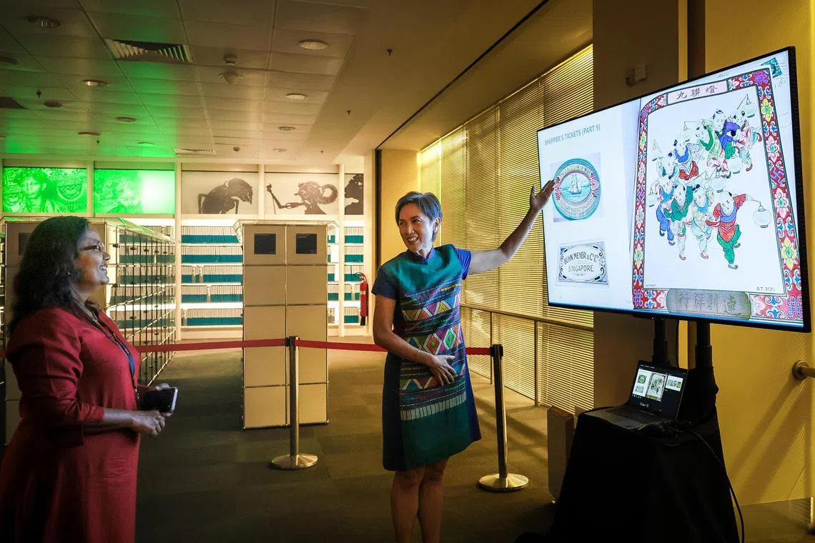 Digital Development and Information Minister Josephine Teo next to a digital display of shipper’s tickets from the 1800s, during a tour of the Rare Collections Gallery.