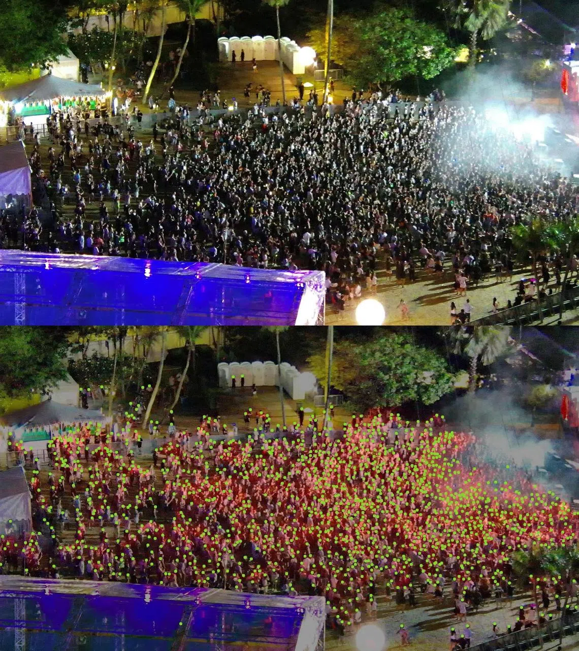 The Q-Crowd Counter used an image of attendees at ZoukOut 2022 taken by a drone (top) and counted the number of people present by marking their heads with green dots.