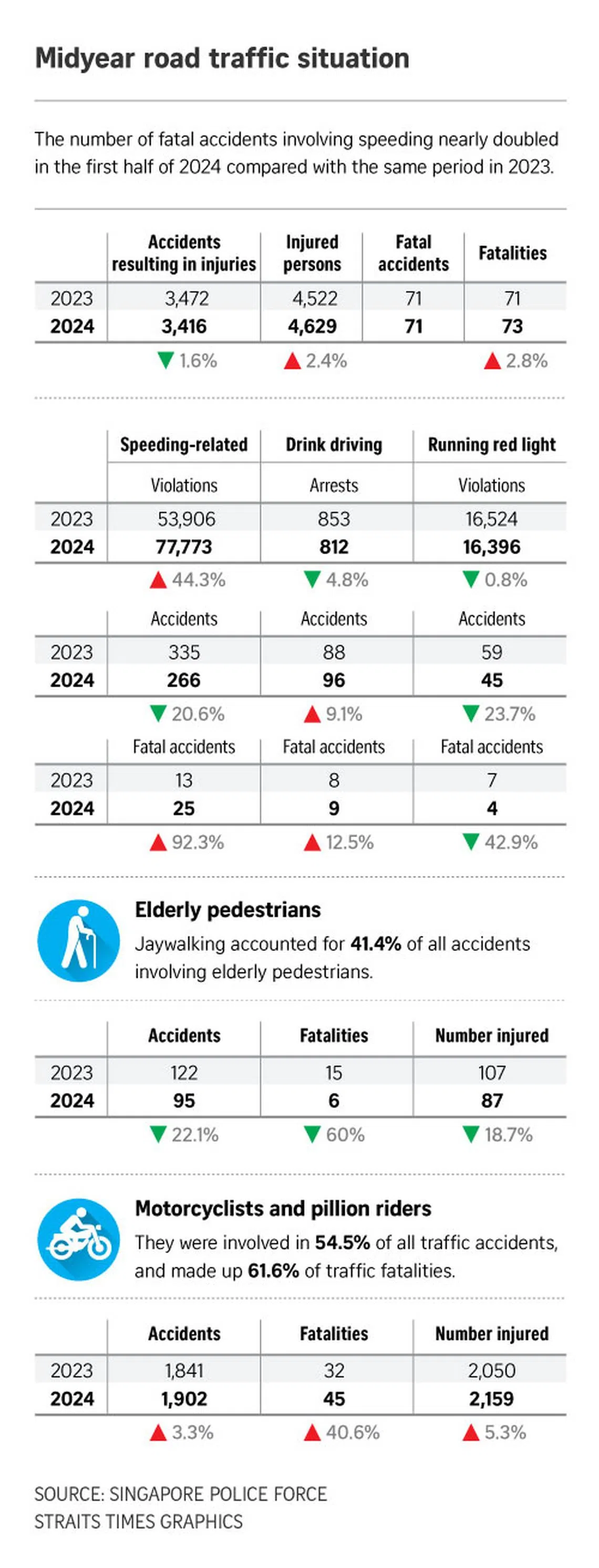 SINGAPORE – There were more fatal accidents caused by speeding and drink driving in the first half of 2024, a period which also saw more people killed on Singapore’s roads.