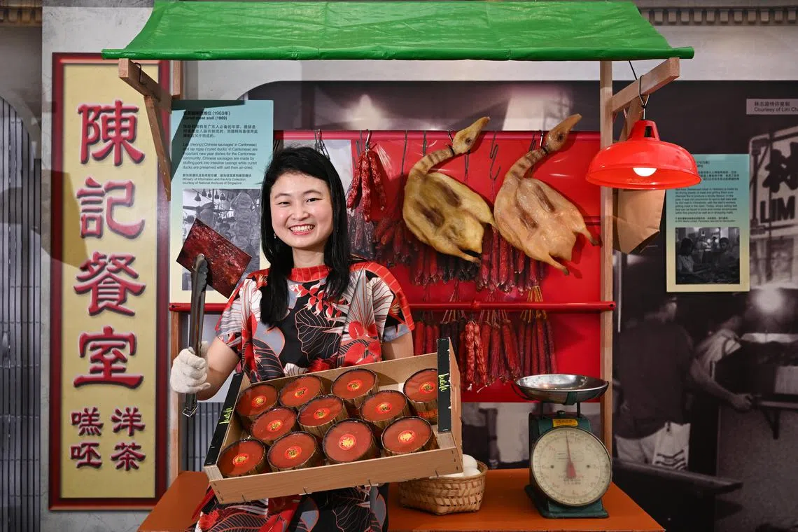 Ms Lin Chia-Tsun, 34, curator of Sun Yat Sen Nanyang Memorial Hall, holding bak kwa and nian gao at a cured-meat stall exhibit.