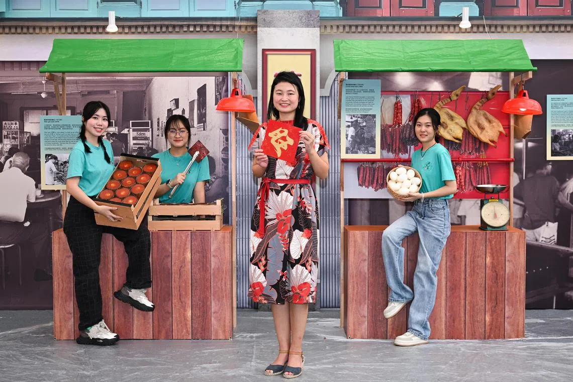 Sun Yat Sen Nanyang Memorial Hall curator Lin Chia-Tsun (foreground) and student guides (from left) Tang Kai En, Guo Yuan Yuan and Feng Siyun posing at the nian gao stall and cured-meat stall exhibits at River Hongbao 2024.