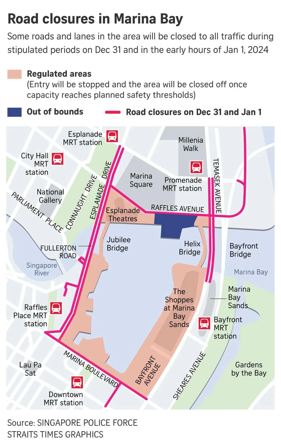 Certain entrances and exits at MRT stations around the Marina Bay area will also be closed to regulate crowd flow, and trains may bypass overcrowded stations to divert people away from congested areas.