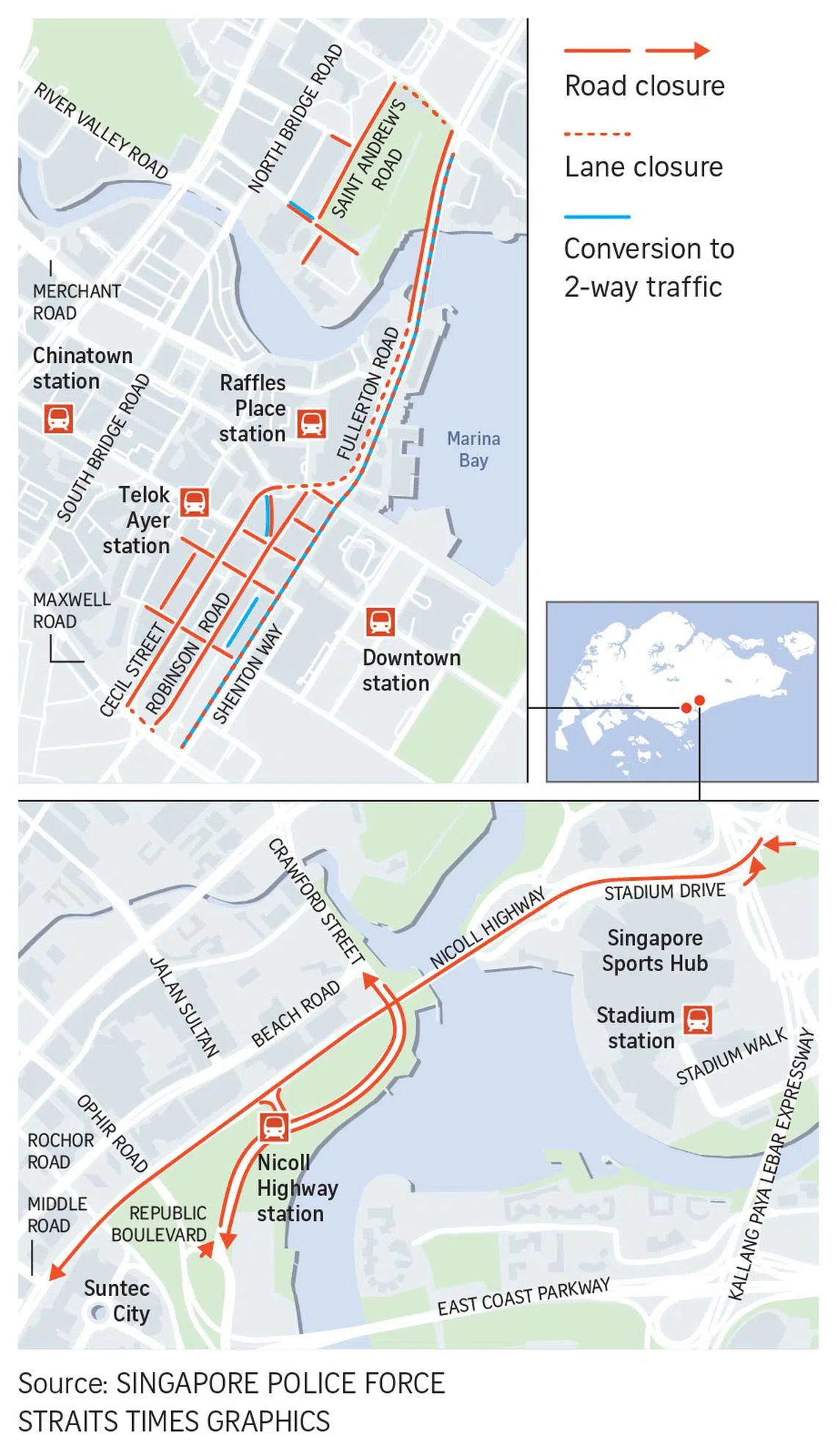 To facilitate these events, several roads and lanes will be closed to vehicular traffic and converted to two-way traffic during the stipulated periods. The road closures will affect the Civic District and Central Business District (CBD).