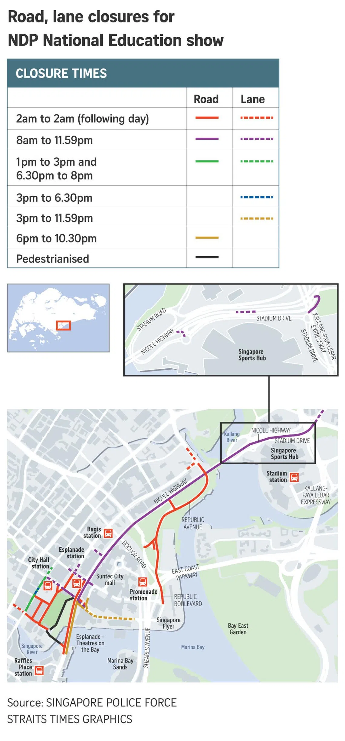 SINGAPORE – A number of roads and lanes will be closed to vehicles on July 20 to facilitate the National Day Parade (NDP) National Education Show 4, which will be held at the Padang.