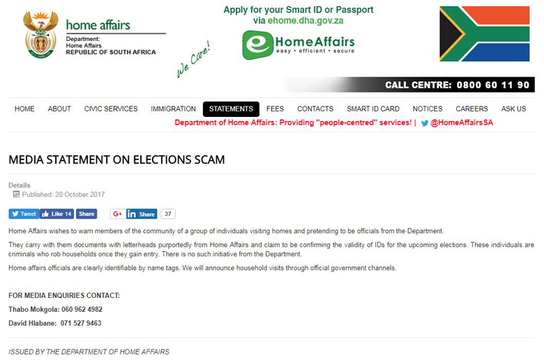 The warning was issued by the Republic of South Africa's Department of Home Affairs and carried on its website in October 2017.