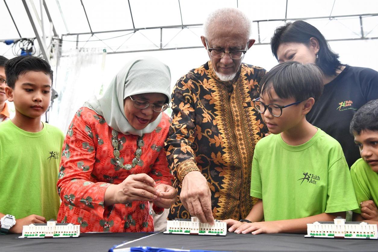 President Halimah Yacob and her husband, Mr Mohamed Abdullah Alhabshee, launch an exclusive Istana model using Lego bricks to commemorate the 150th anniversary of the Istana.