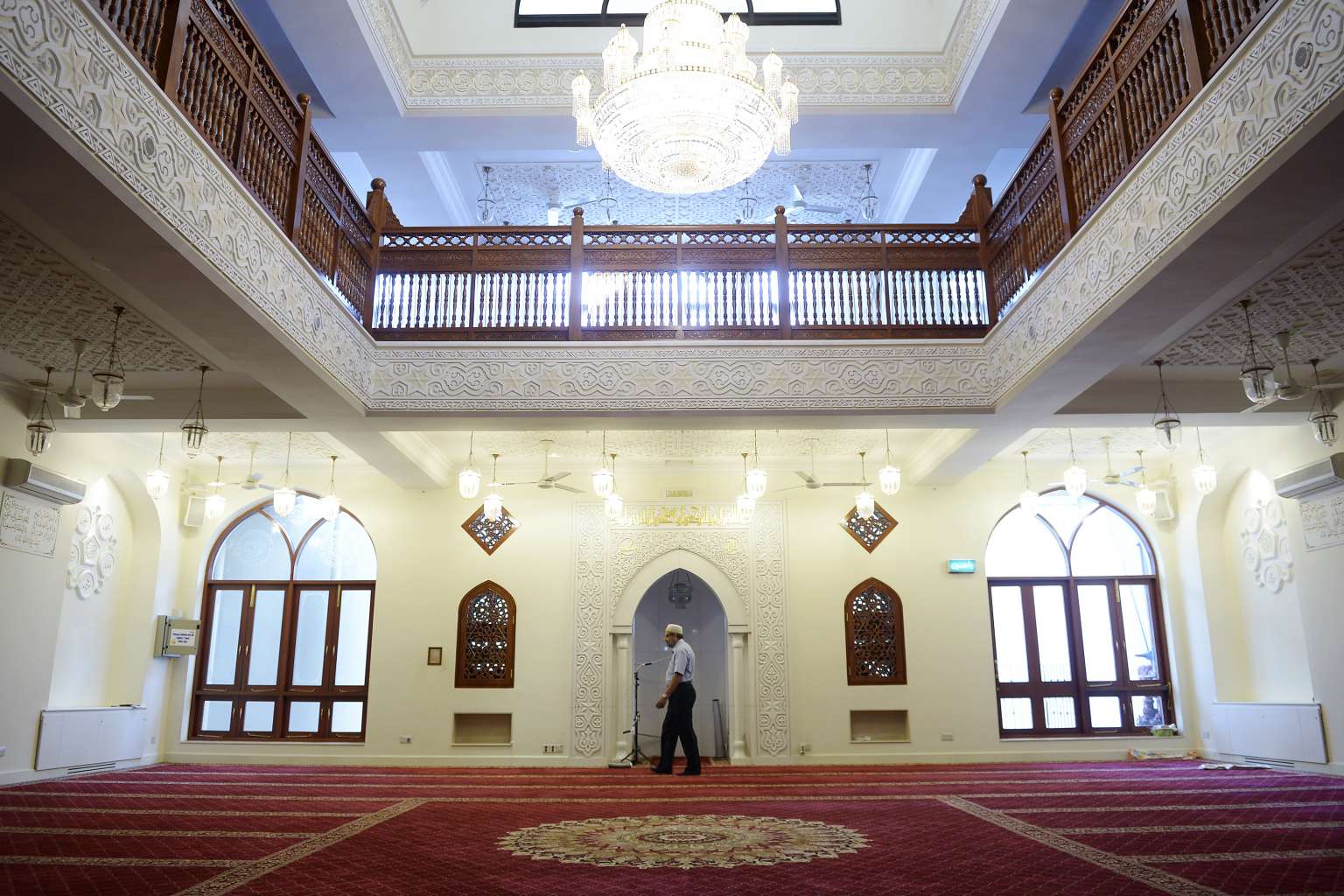 The prayer hall inside the Masjid al Burhani mosque located at Hill Street. First built as a single-storey mosque in 1897 by merchant AM Essabhoy, it was rebuilt in 1956, then renovated and reopened as a 10-storey mosque complex in 2000.