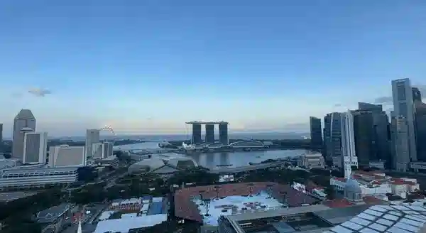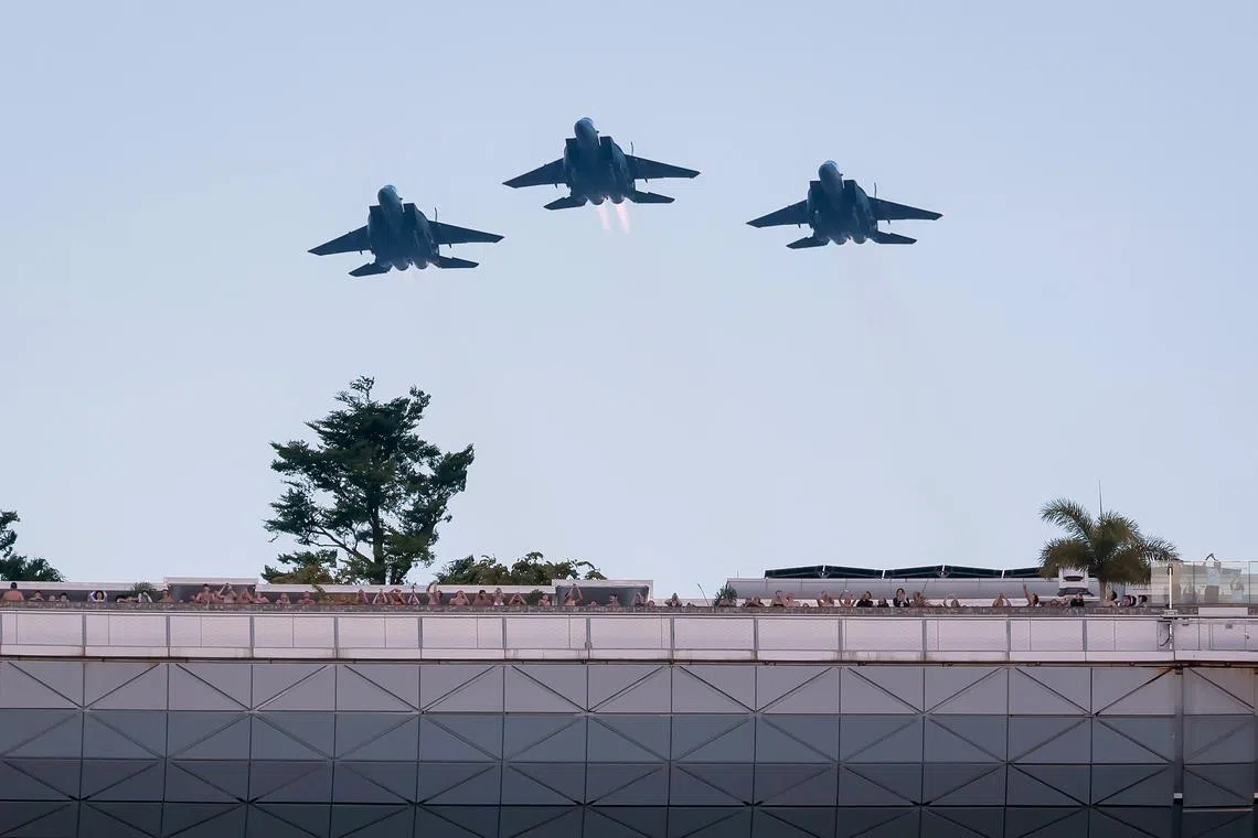 Three F-15SG fighters flying over Marina Bay during the National Day Parade.