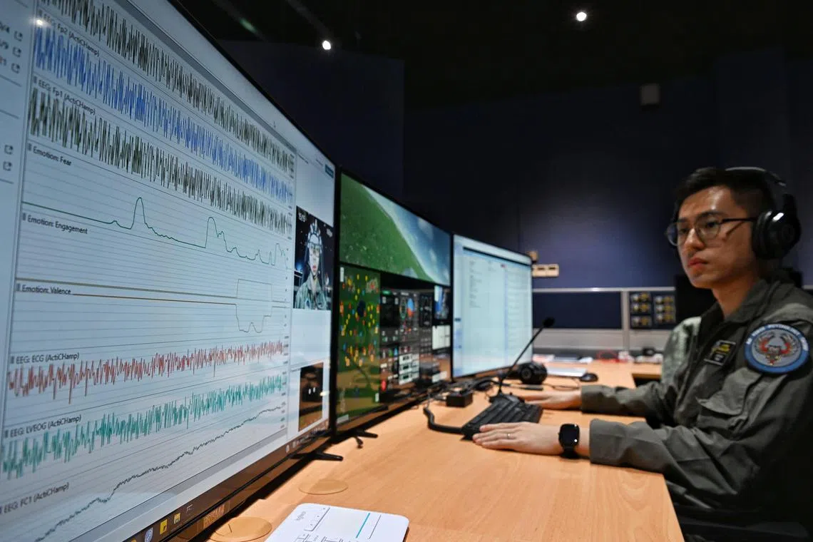 RSAF aviation psychologist Aaron Lim monitors the brainwave and heart rate signals of a pilot trainee during a training session.