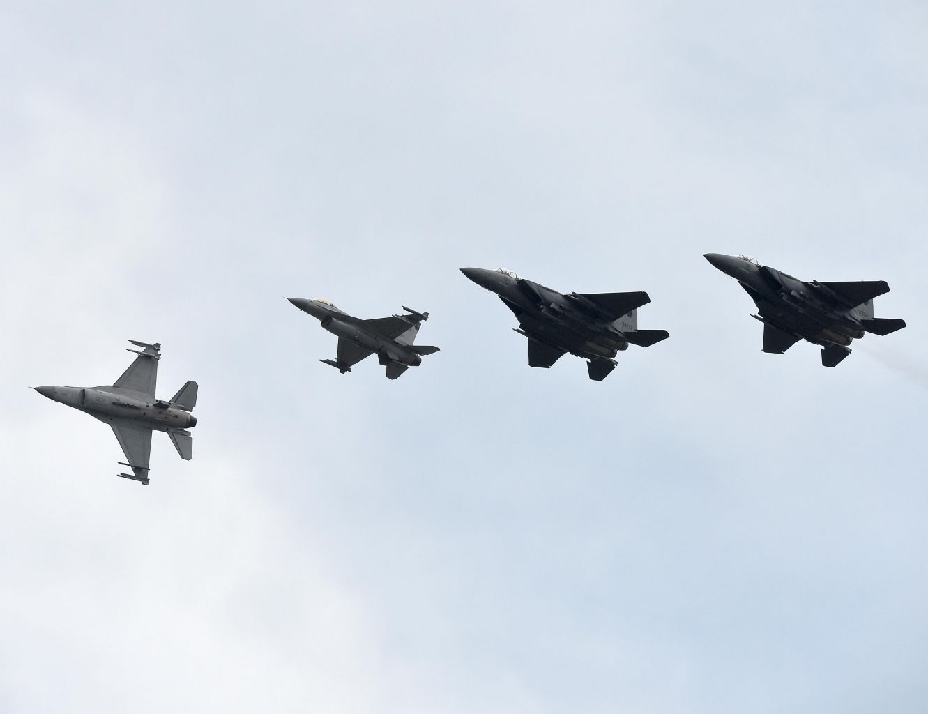 The Republic of Singapore Air Force (RSAF)'s F-15SG and F-16C fighter aircrafts in an aerial display on May 21, 2016.