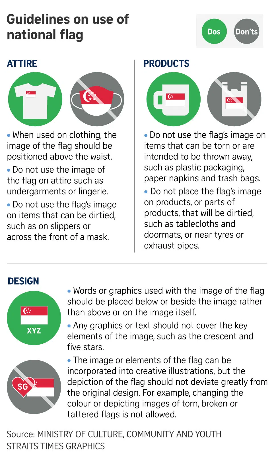 To encourage the use of the flag to showcase national pride, Singaporeans and businesses will not need to seek approval from the Minister for Culture, Community and Youth in two instances, as long as the flag or its image is used respectfully: