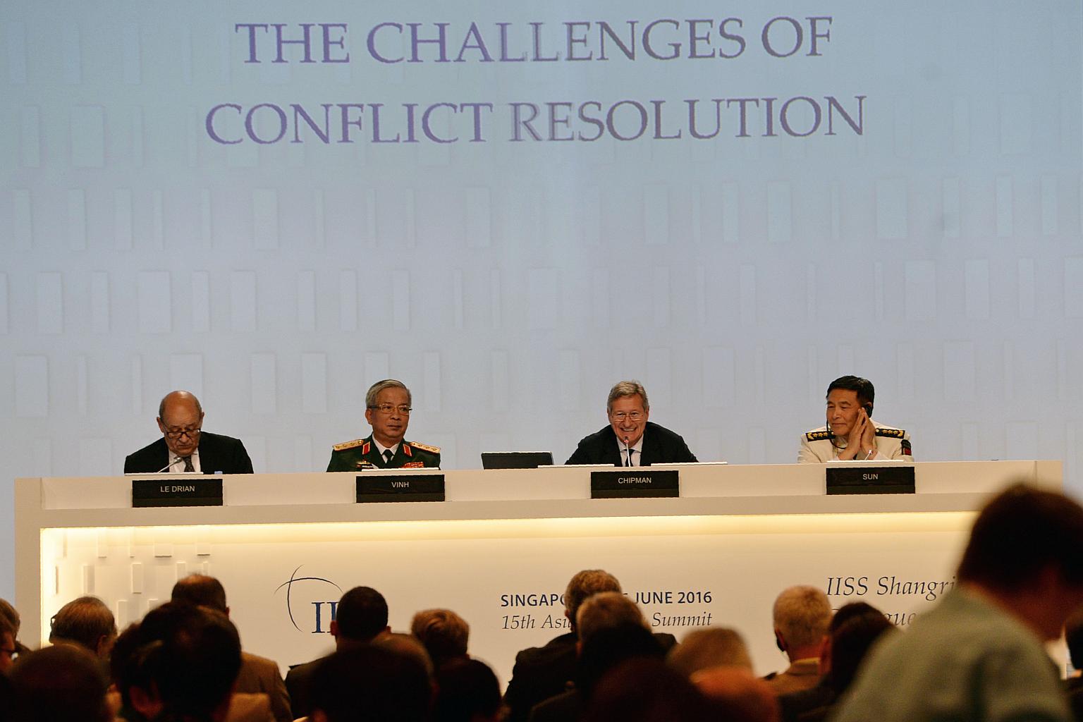(From left to right) French Minister of Defence Jean-Yves Le Drian, Vietnam's Vice Minister of Defence Nguyen Chi Vinh, director-general and chief executive of IISS John Chipman, and China's deputy chief of general staff of the Chinese PLA Admiral Sun Jianguo at the 15th IISS Shangri-La Dialogue in Singapore on June 5.