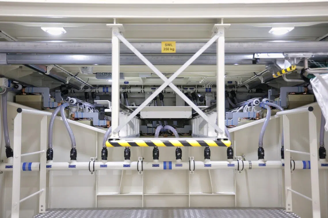 The trainer clones these cramped spaces, where engineers spend up to six hours lying prone while performing tasks such as preventive maintenance or checks, providing budding submariners with a realistic environment to practise battery maintenance work.
