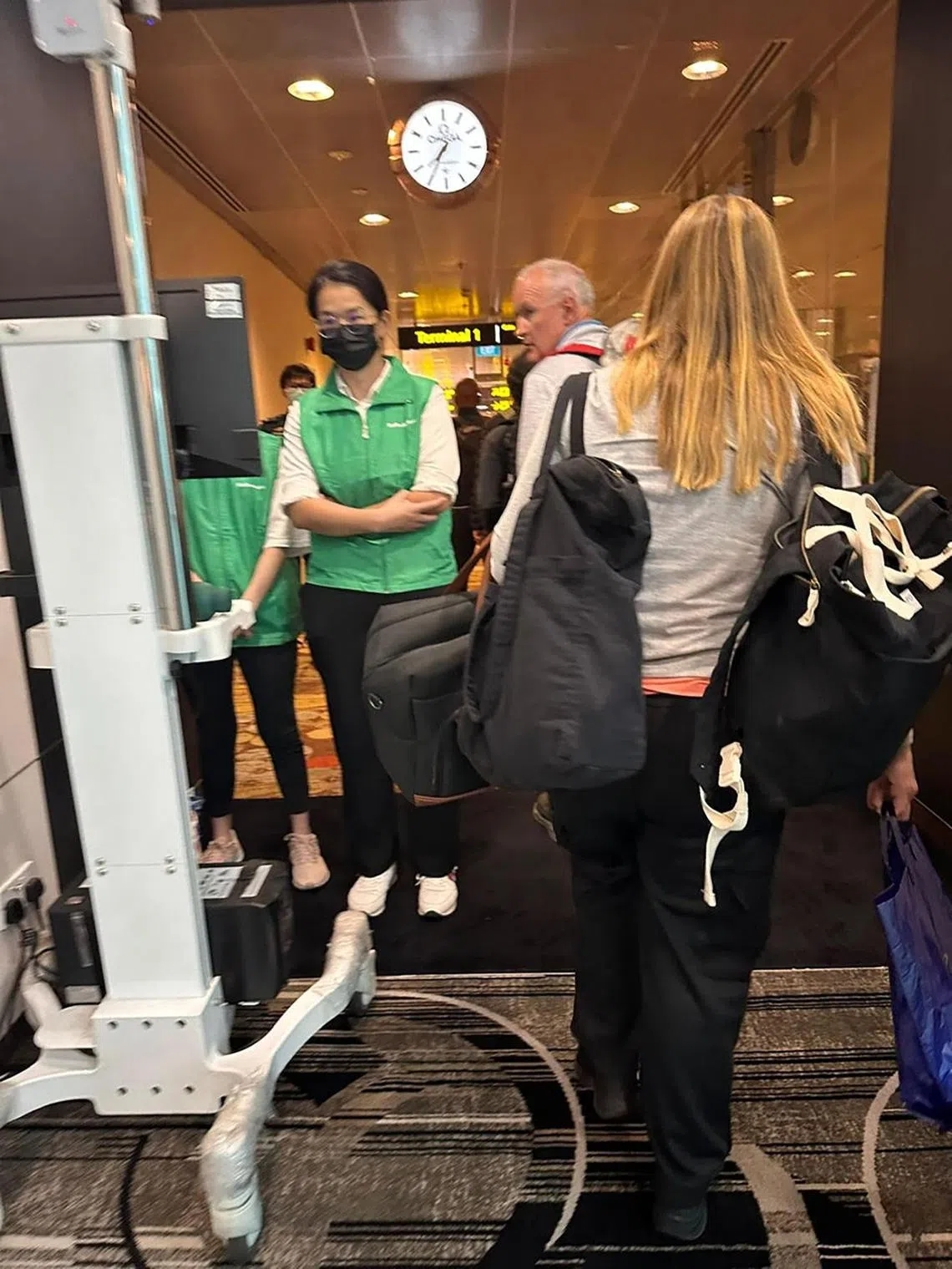 Raffles Medical staff (in green vests) manning the scanners at Changi Airport.