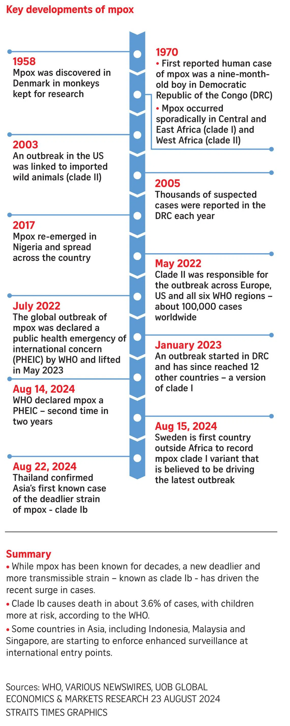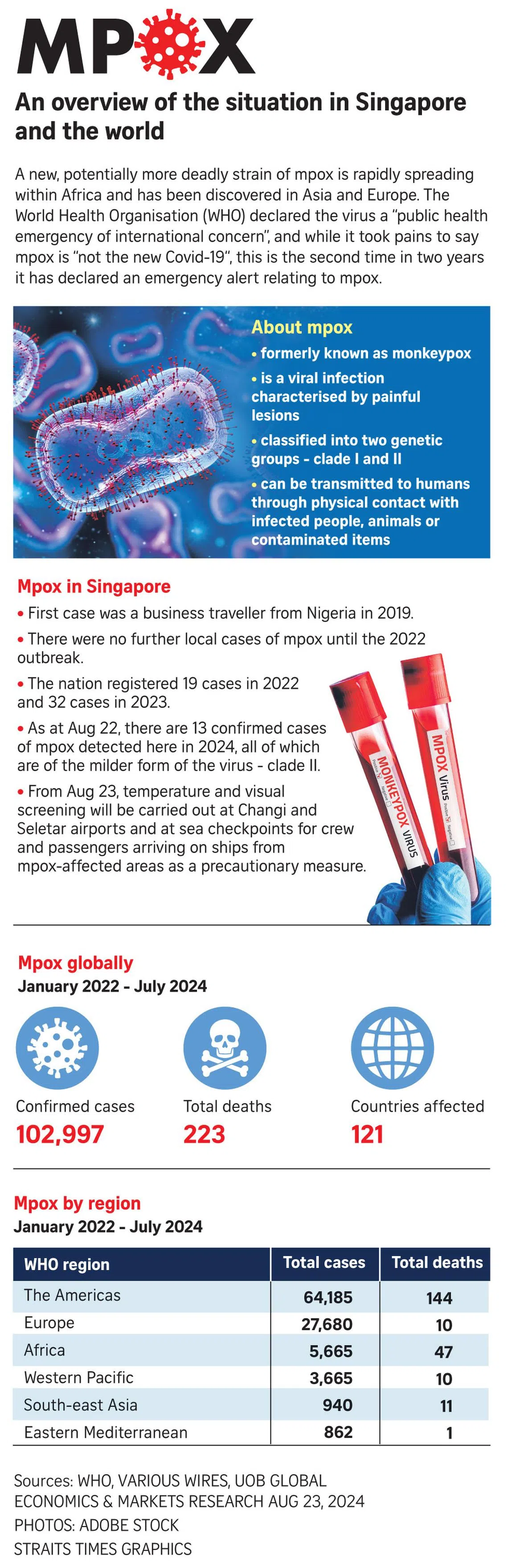 There are no direct flights between Singapore and any country with an mpox outbreak, but there will be temperature and visual screening at Changi and Seletar airports for inbound travellers and crew arriving via flights from places that may be exposed to the risk of mpox outbreaks.