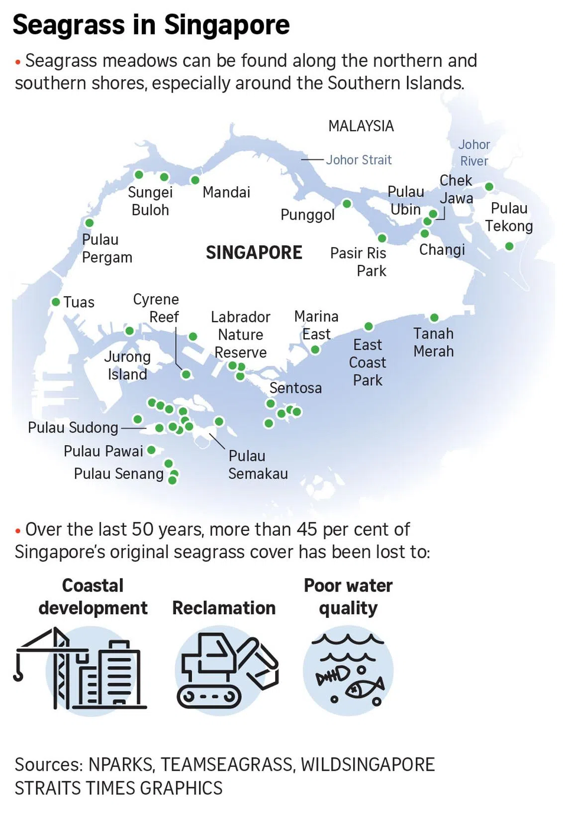 But more than 45 per cent of Singapore’s original seagrass cover has been lost to coastal development and reclamation over the last five decades.