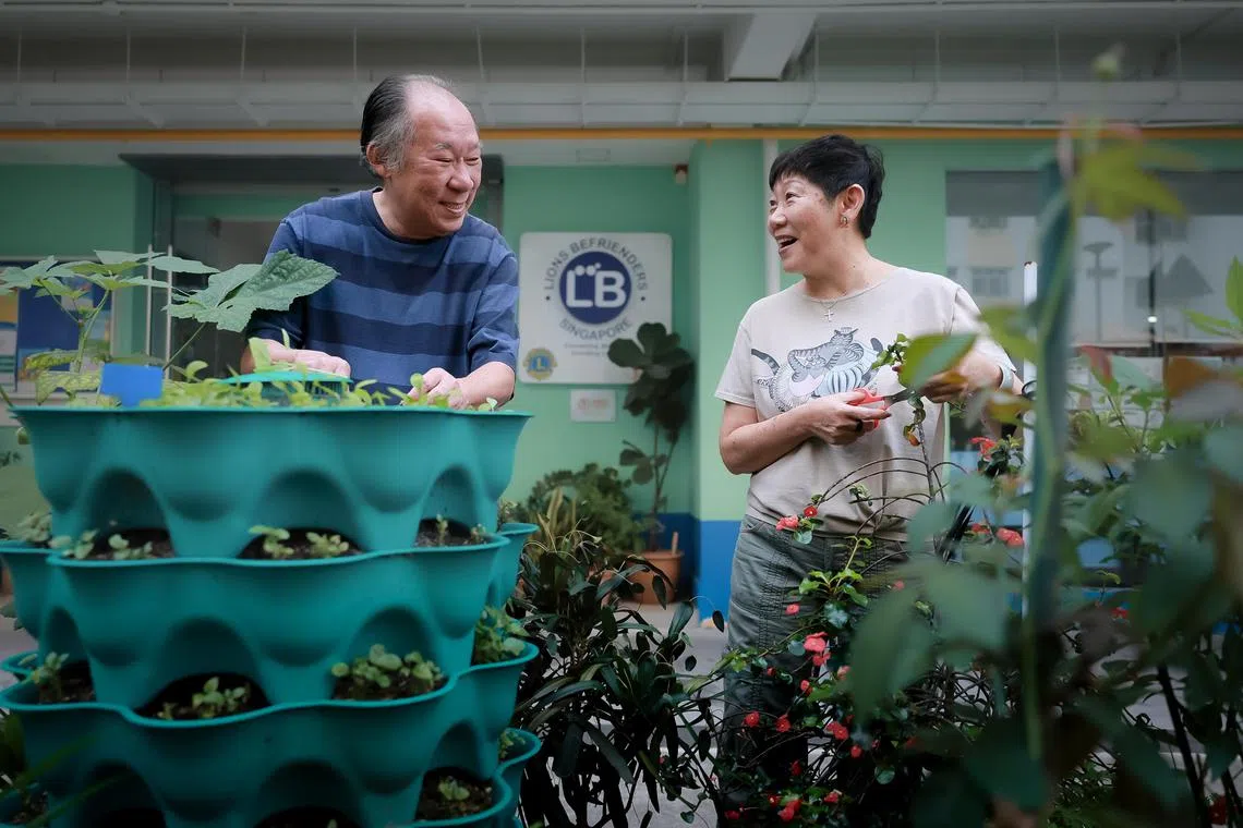 Married couple Richard Foo, 68, and Cecilia Tan, 64, gardening at the Lions Befrienders Active Ageing Centre at Block 18 Ghim Moh Road on July 4.