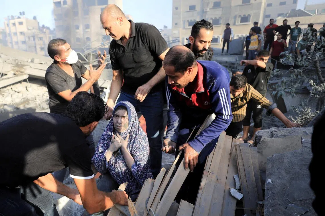 Rescuers helping a Palestinian woman during a search for casualties at the site of an Israeli strike on a residential building in Gaza City, on Oct 25, 2023.