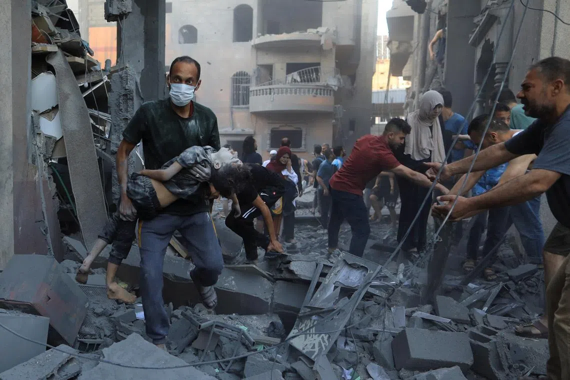 A Palestinian rescue worker carrying a child who was a casualty of Israeli strikes on houses in Khan Younis city in the southern Gaza Strip, on Oct 26, 2023.
