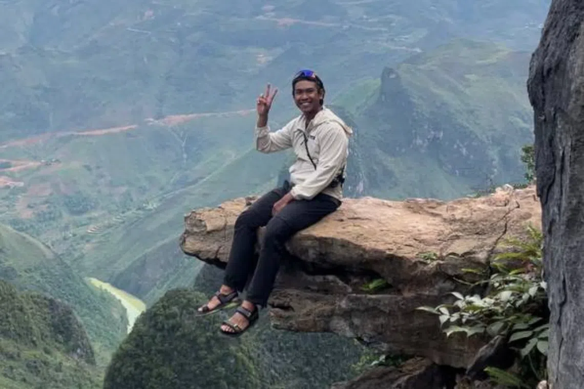 Mr Ramadhan Rajab perched atop a cliff in Ha Giang, Vietnam.
