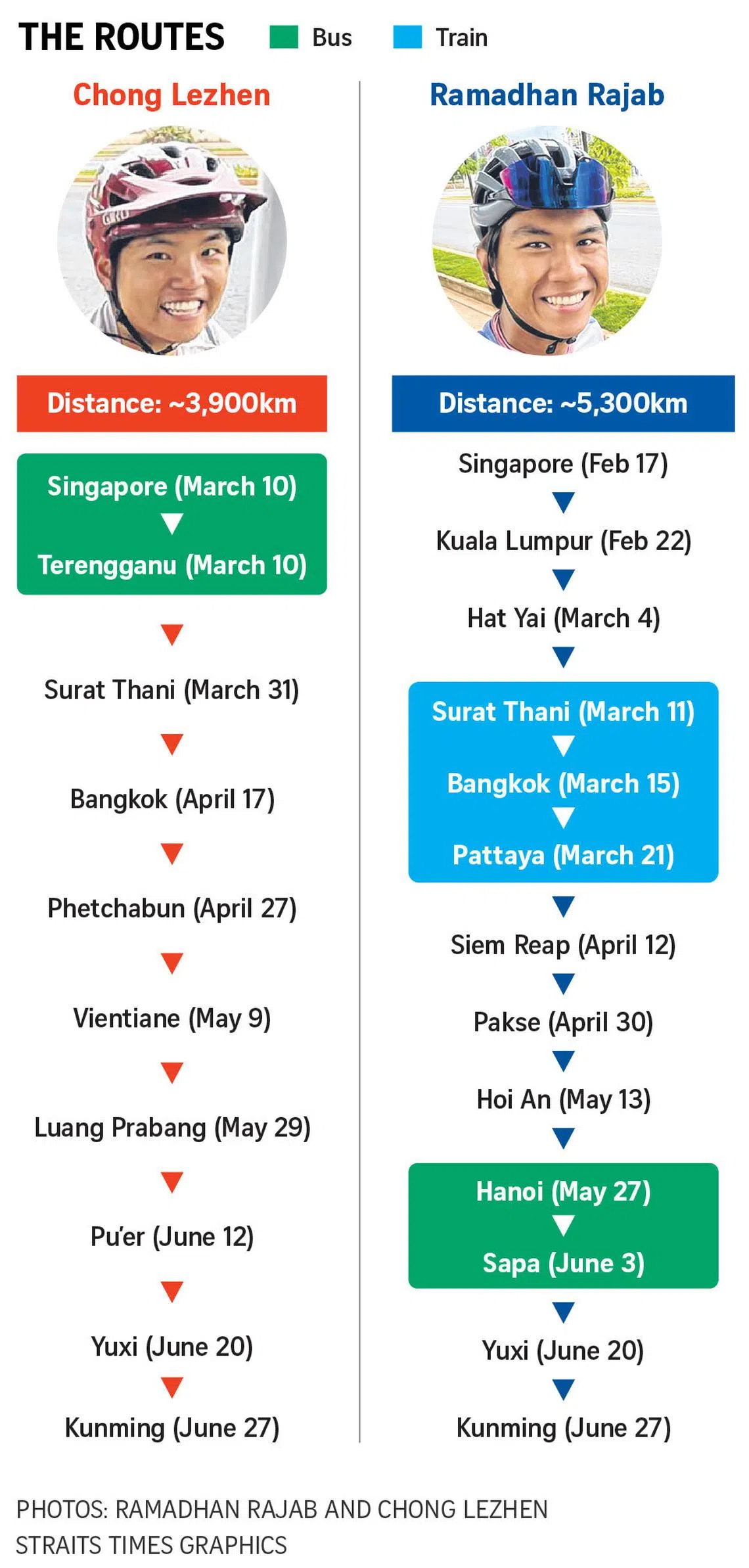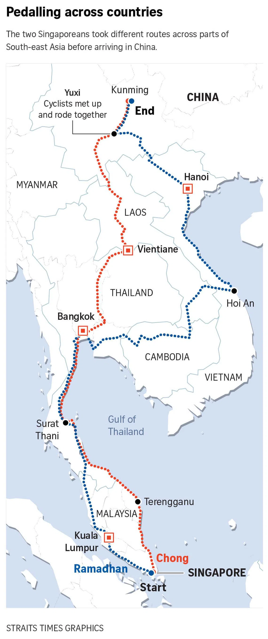 The two Singaporeans had embarked on separate “bikepacking” trips almost a month apart – Mr Ramadhan on Feb 17 and Mr Chong on March 10 – and had taken different routes across parts of South-east Asia.