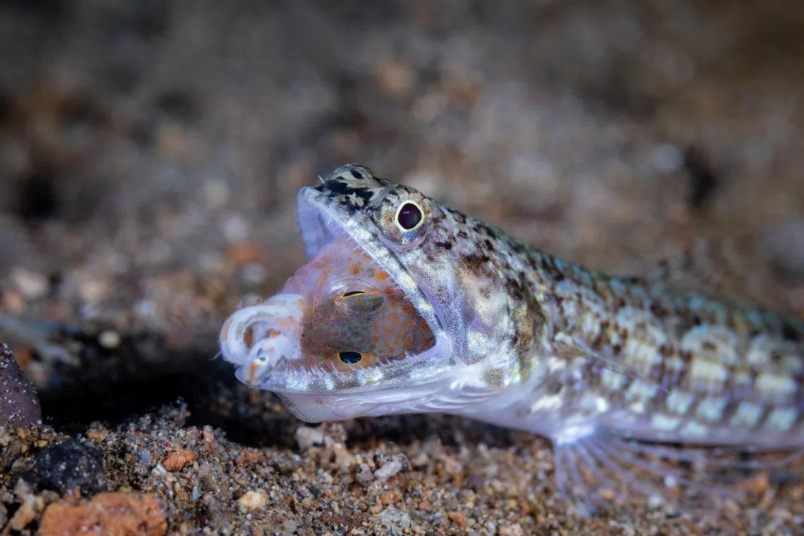 Whitebait fish in the mouth of a grouper that was in the mouth of a lizardfish.