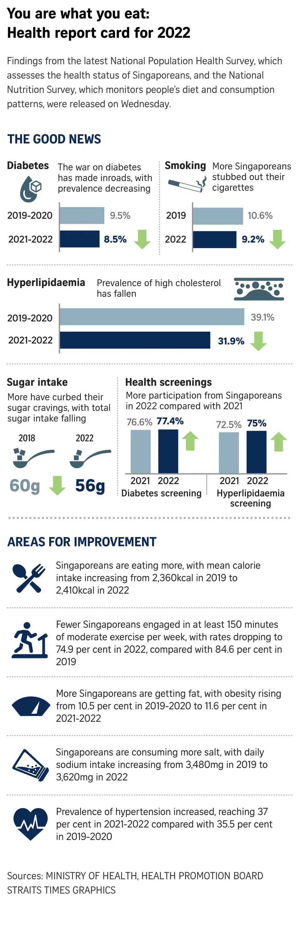 The 2022 National Population Health Survey (NPHS) tracked the health and risk factors of residents aged 18 to 74 between July 2021 and June 2022. The National Nutrition Survey, under HPB, looks at the diet and eating habits of adult Singapore residents, and its latest survey provides information on those aged 18 to 69 between 2019 and 2022.