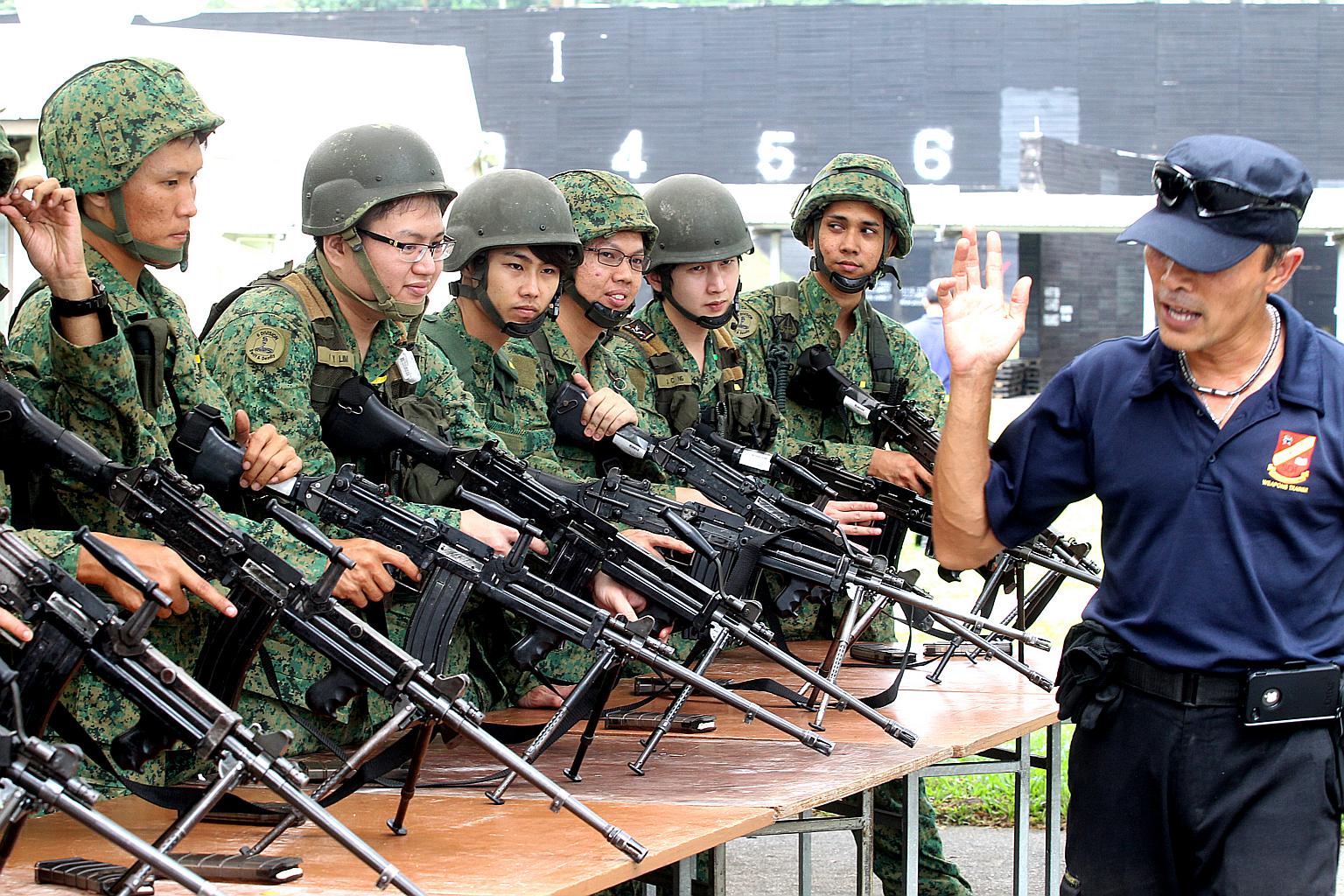 National servicemen (NSmen) inspecting their weapons before a live firing exercise during a mobilisation exercise at Nee Soon Camp.