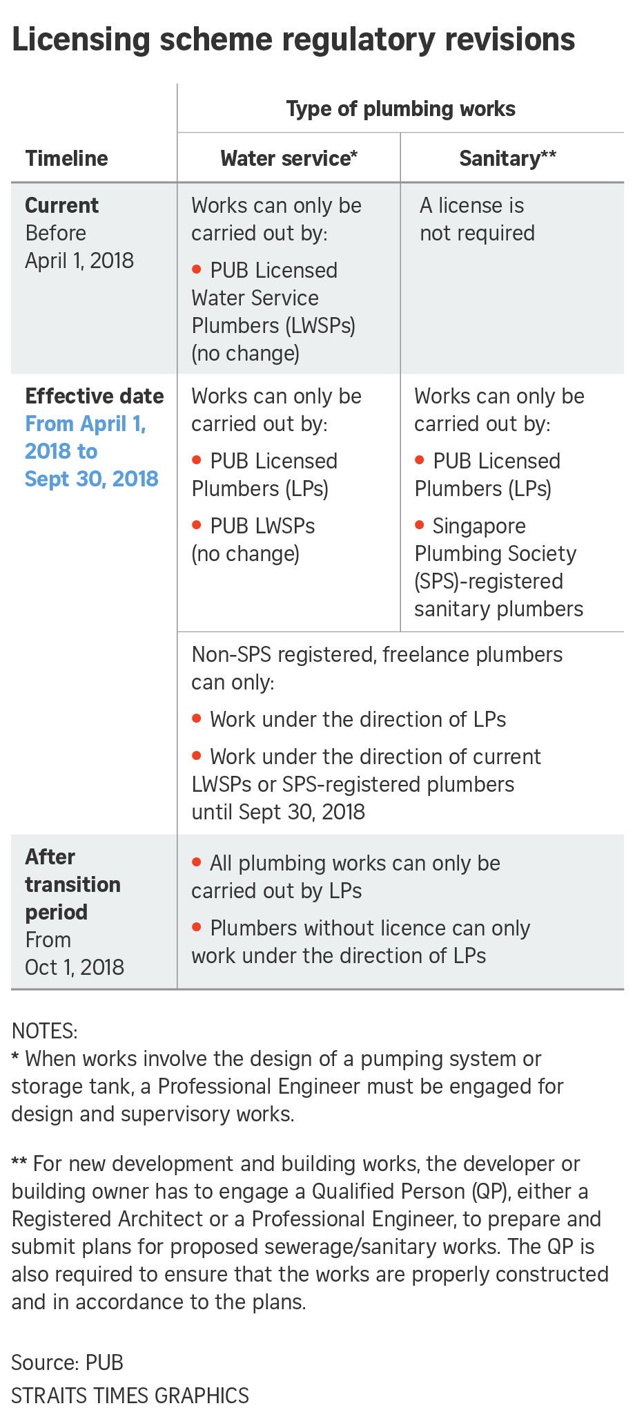 SINGAPORE - Sanitary plumbers will need to be licensed under PUB's revised licensing scheme, which will take effect from April 1 next year.