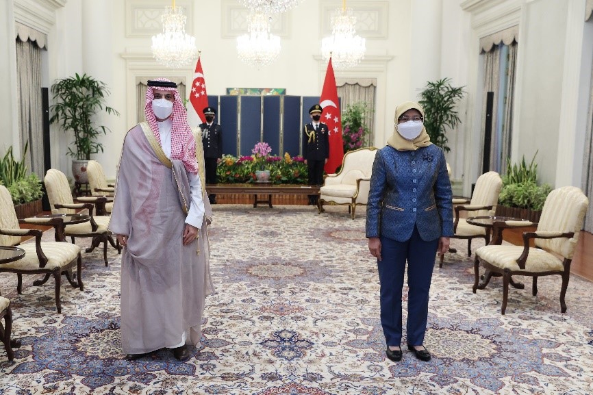 Saudi Arabia's Minister of Foreign Affairs, Prince Faisal Farhan Al Saud, calls on President Halimah Yacob at the Istana on Jan 13, 2022.