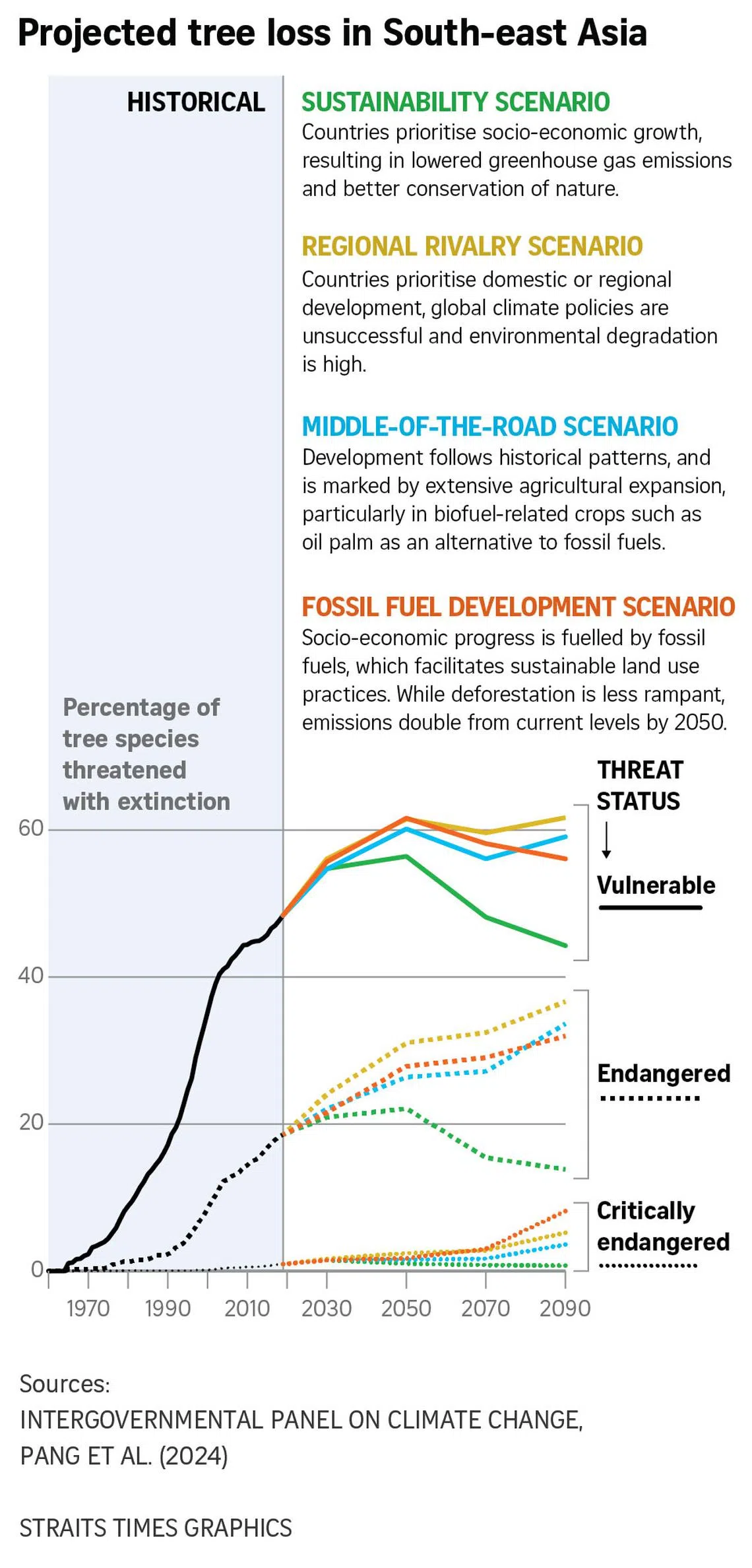 For the study, the researchers found that only in the lowest emissions pathway, or the “sustainability scenario”, would tree cover in South-east Asia increase. This scenario assumes that the world limits warming to below 2 deg C above pre-industrial levels – the threshold which scientists say can help the world ward off catastrophic climate impacts.