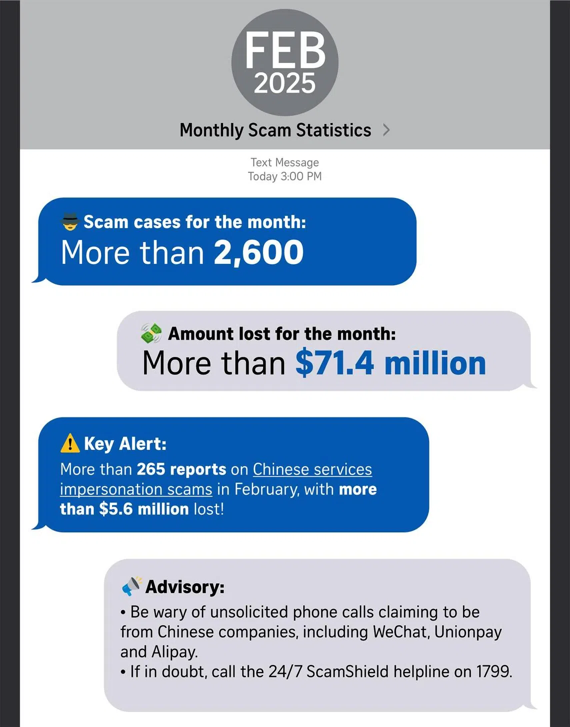 There were more than 2,600 cases of scams in February, of which more than 265 reports were for Chinese services impersonation scams involving more than $5.6 million in total.