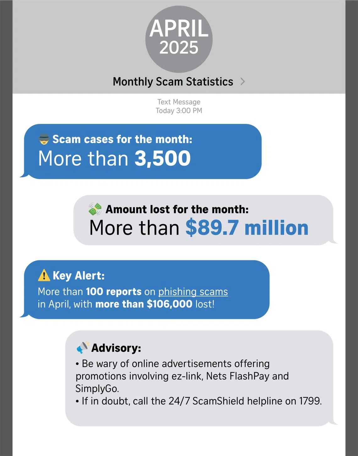 There were more than 3,500 scam cases reported in April. A phishing scam variant involving offers of unlimited travel on public transport was the subject of over 100 reports, with its victims losing $106,000.