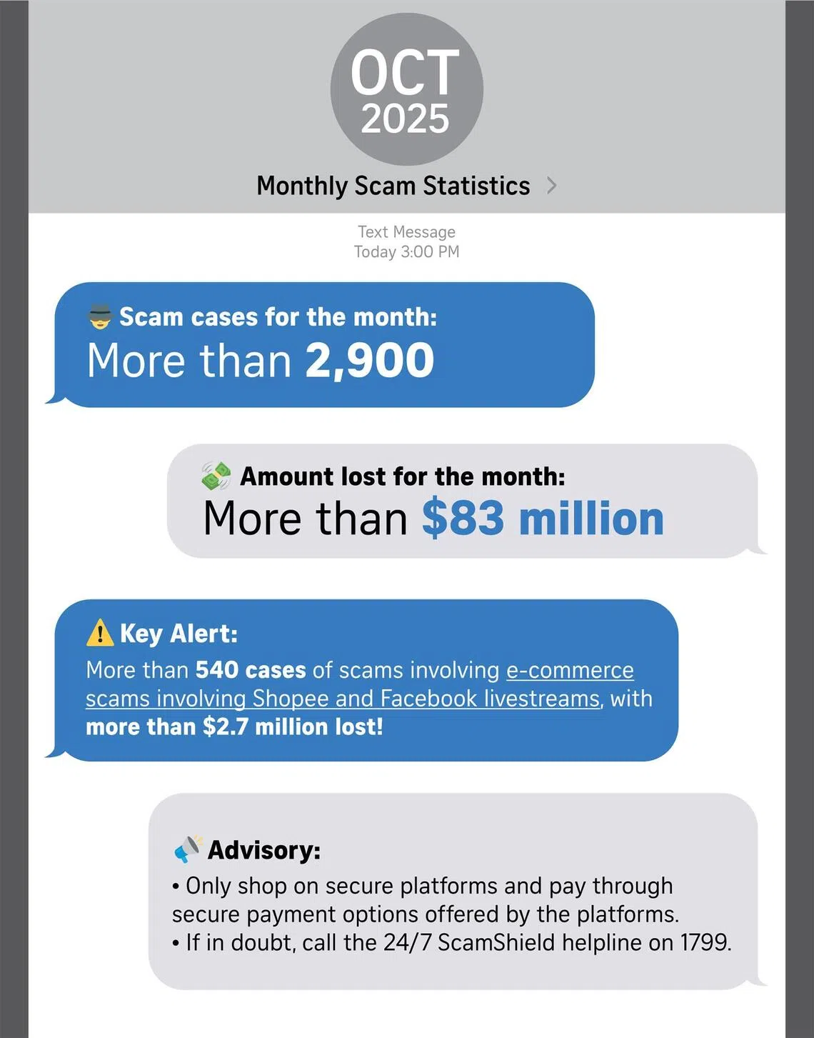 Over 2,900 scam cases were reported in October, with victims losing more than $83 million. This includes over 540 e-commerce scam cases involving live streaming on Shopee and Facebook, resulting in victims losing more than $2.7 million.