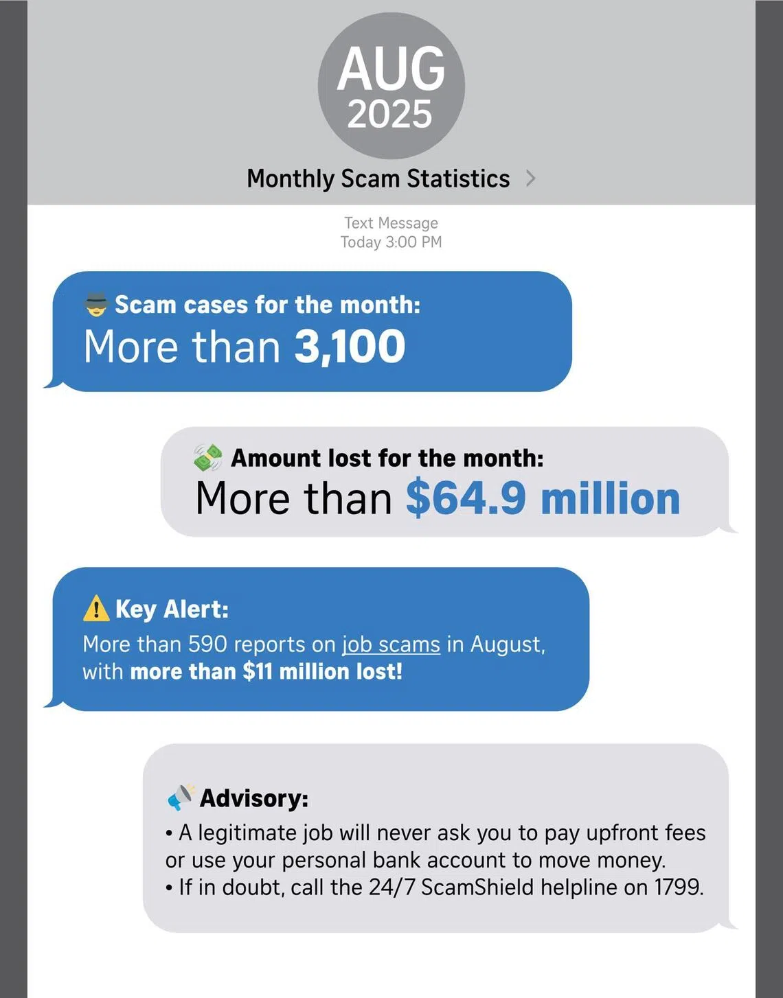 More than 3,100 cases of scams were reported in August, with victims losing more than $64.9 million. These included 590 reports of job scams, with victims losing more than $11 million.